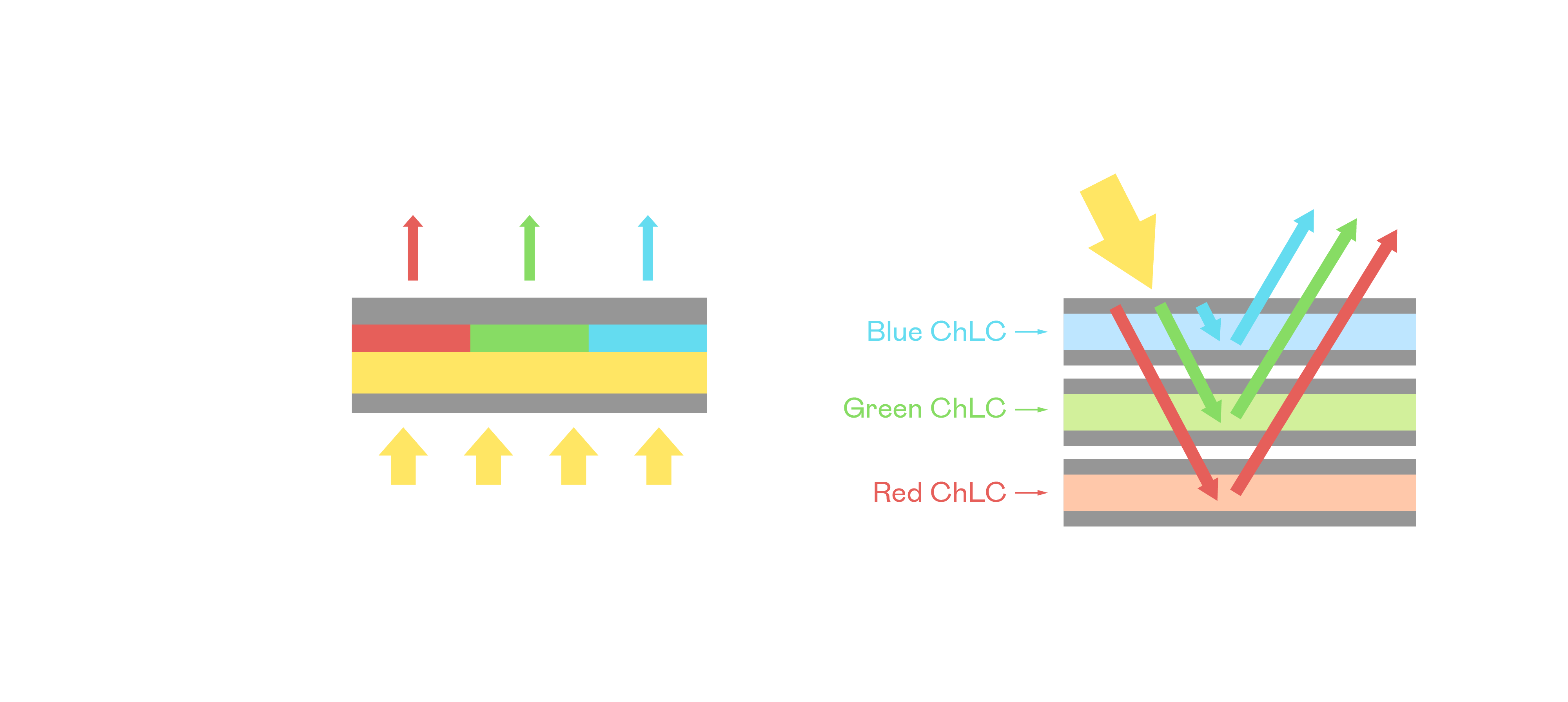 hth华体育官网网页版膽固醇液晶顯示器是由紅、綠、藍三層膽固醇液晶面板堆疊而成,並採用無彩色濾光片設計,減少環境光在反射過程中的損耗。